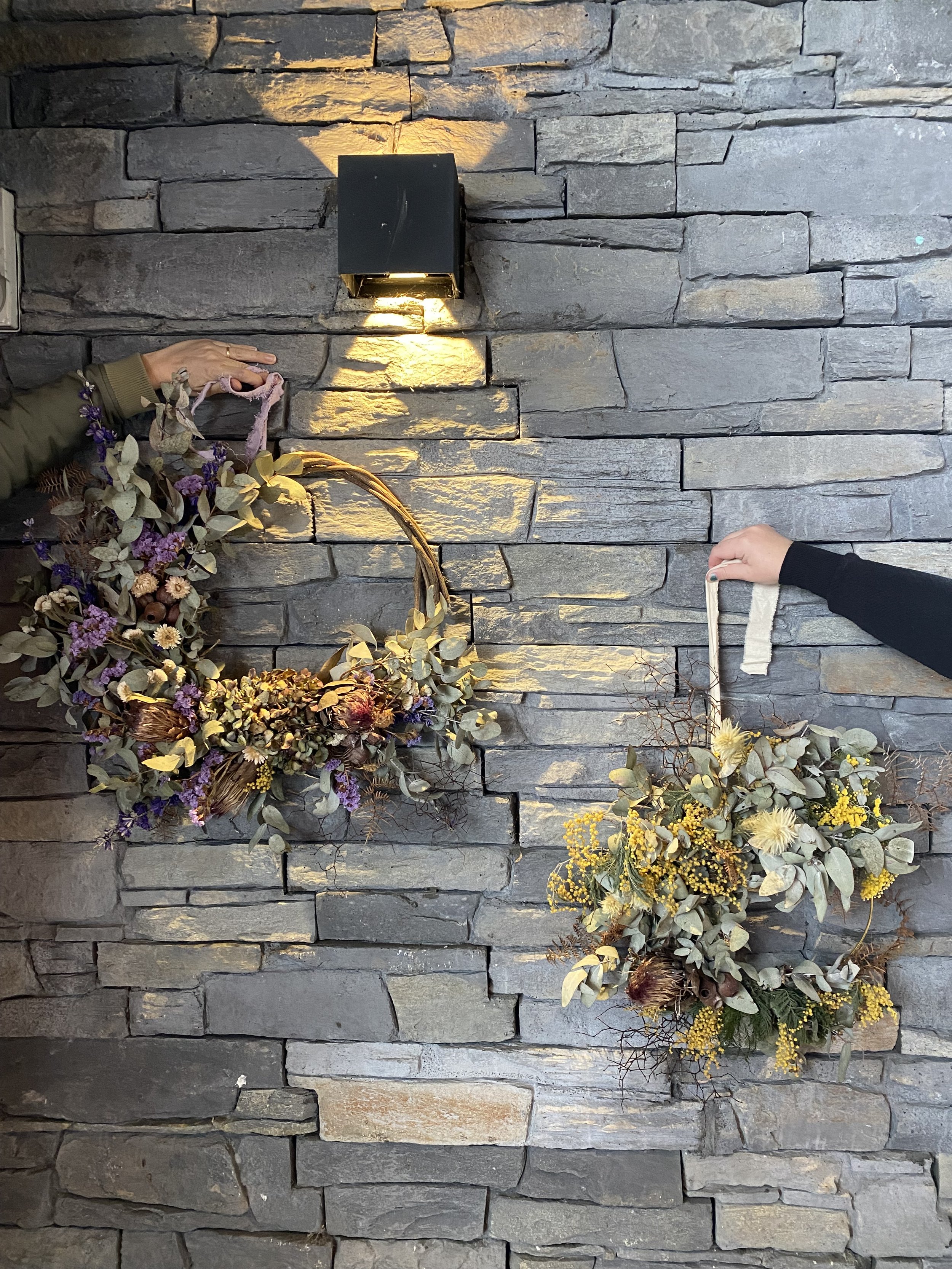 We do a range of workshops but not limited to wreaths, boho wall arrangements, vase arrangements, bouquets, flower crowns, and decorative palms.